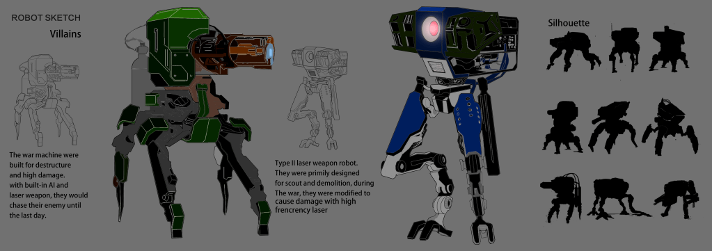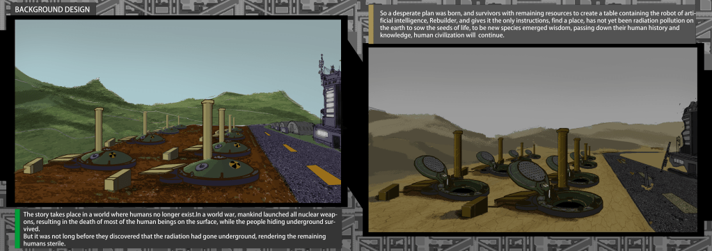 So I came up with a story of, robots continuing their mission to restore the environment, after the nuclear war that kills all the humans. And hopefully the restored environment will breed another intelligent species, so the robot could tell the human history to the new one, and inherit the human legacy.
