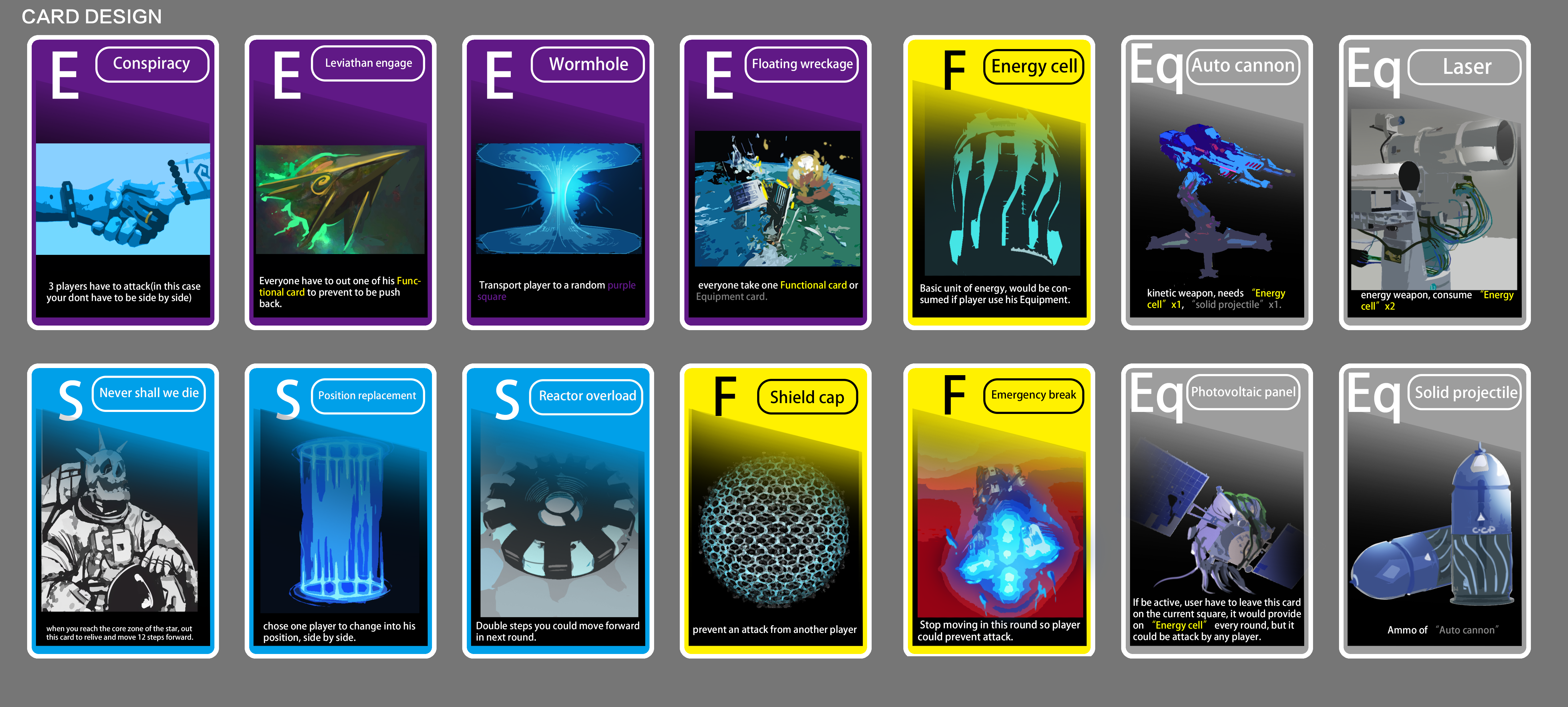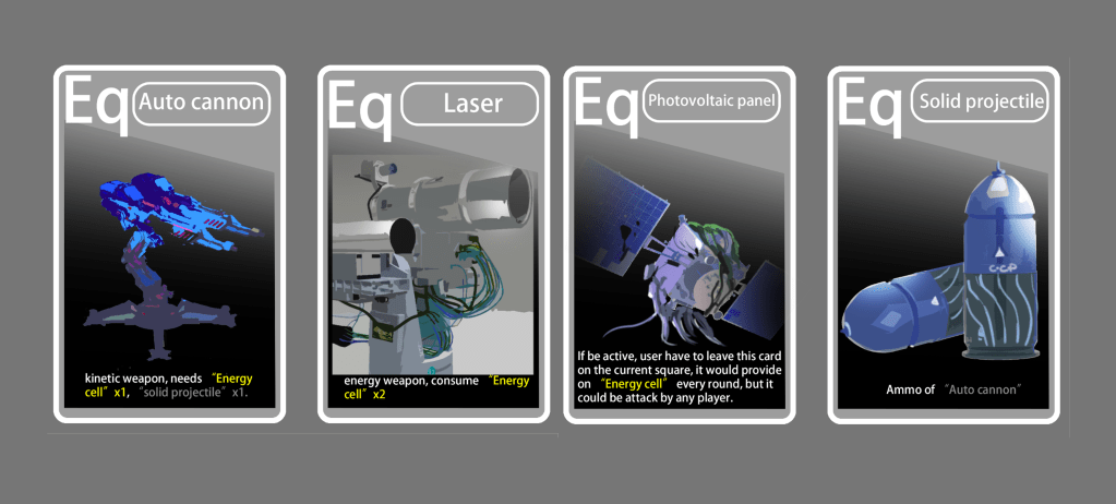 At each turn, player could also decide to use their energy token on their equipment. The cards should be placed on the “Equipment” zone at the each conner of the board.