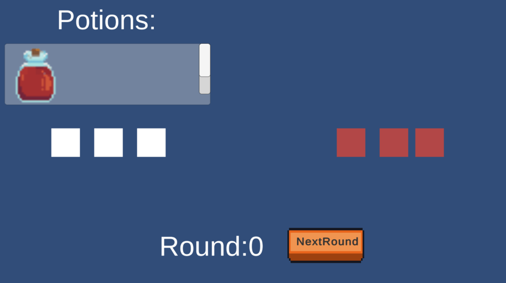 This is a simple graph version of a auto battler. Red square means enemies, white means adventurers. Above them, is potions that you just crafted and bought buy them.